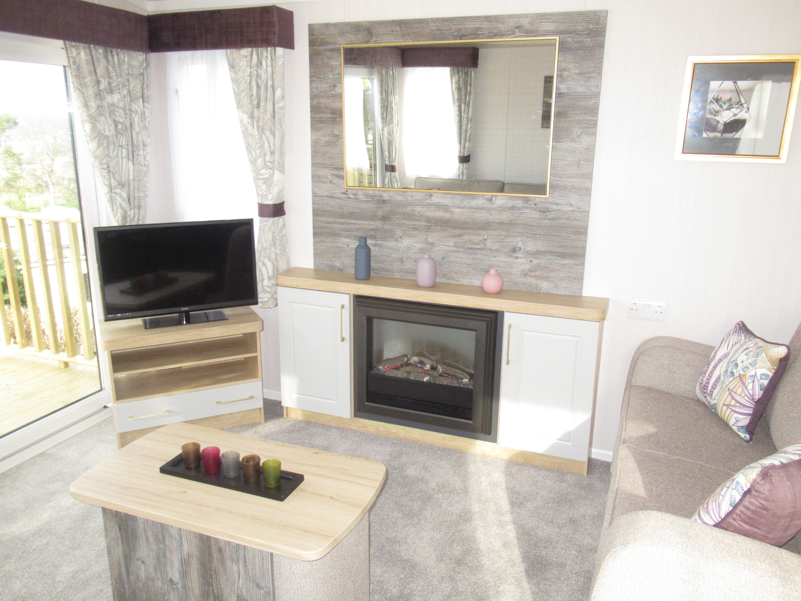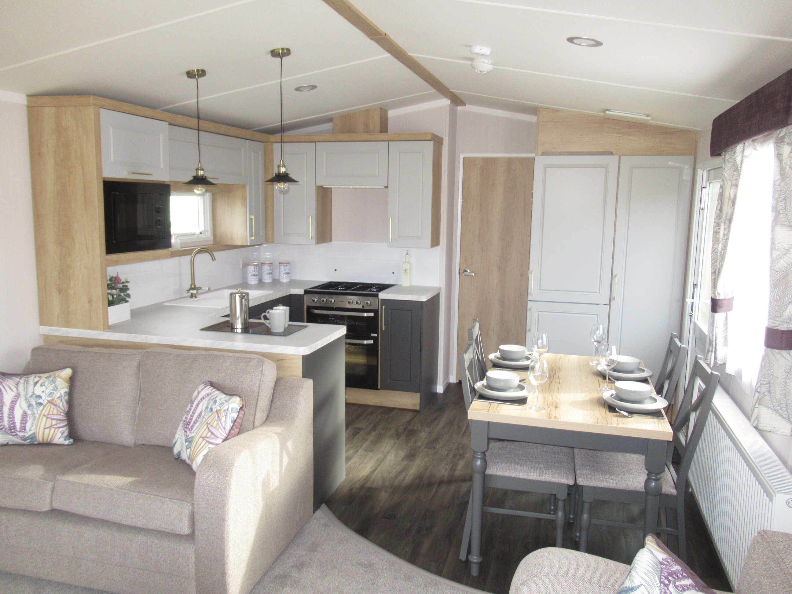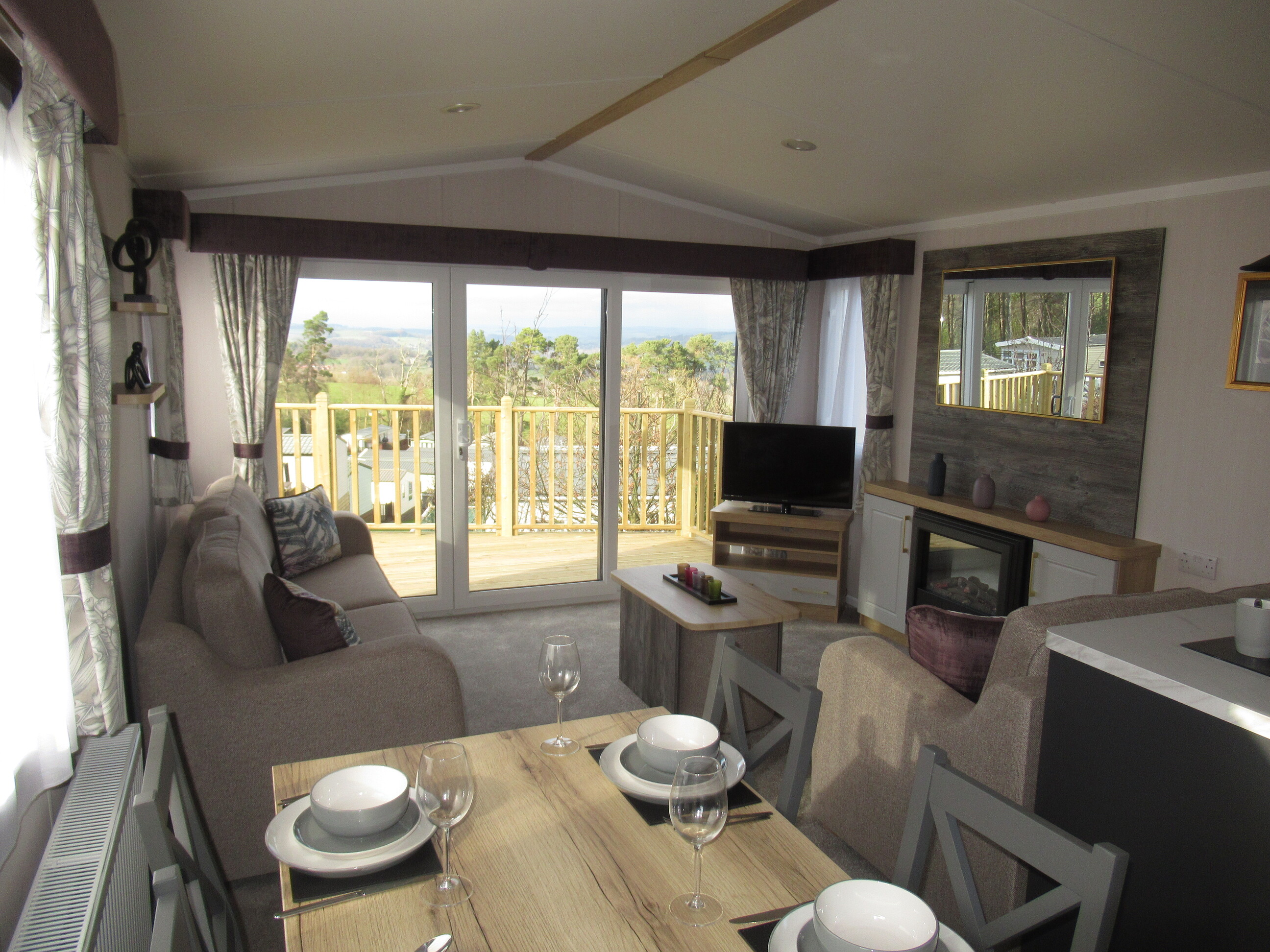 - The spacious and beautifully designed lounge features stylish freestanding furniture, including luxury three- and two-seater sofas, creating a modern and comfortable living space. A feature log-effect electric fire adds warmth and atmosphere, making it perfect for relaxing all year round while enjoying the stunning surrounding views.